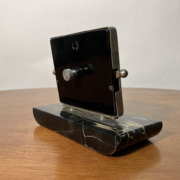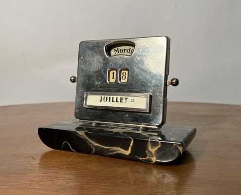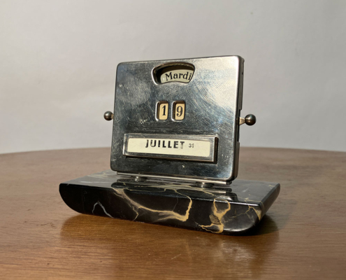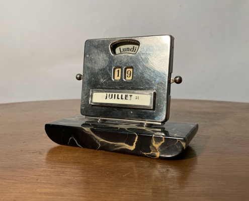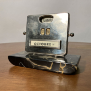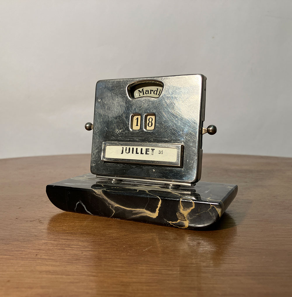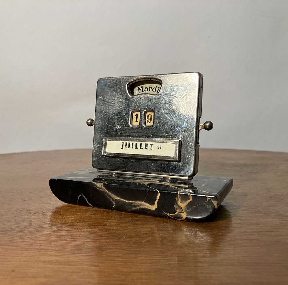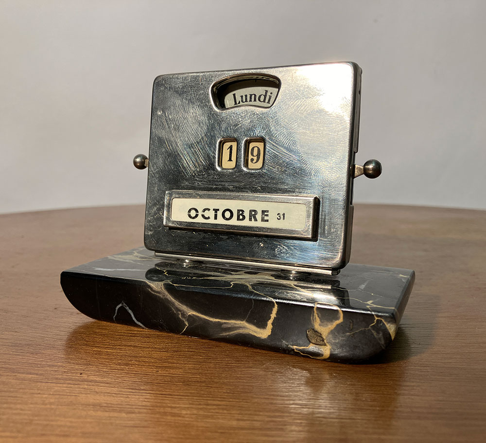 The calendar is mounted on a black Belgian marble base, with a chrome-plated steel front.